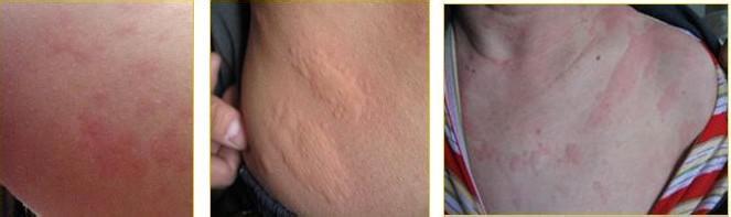 基本损害为皮肤出现风团。常先有皮肤瘙痒,随即出现风团,呈鲜红色或苍白色、皮肤色,少数患者有水肿性红斑。风团的大小和形态不一,发作时间不定。风团逐渐蔓延,融合成片,由于真皮乳头水肿,可见表皮毛囊口向下凹陷。风团持续数分钟至数小时,少数可延长至数天后消退,不留痕迹。皮疹反复成批发生,以傍晚发作者多见。风团常泛发,亦可局限。有时合并血管性水肿,偶尔风团表面形成大疱。